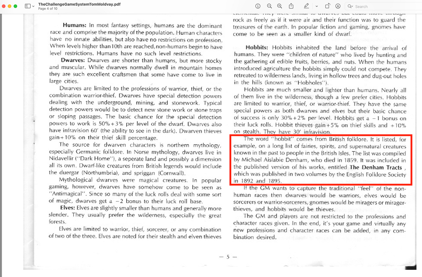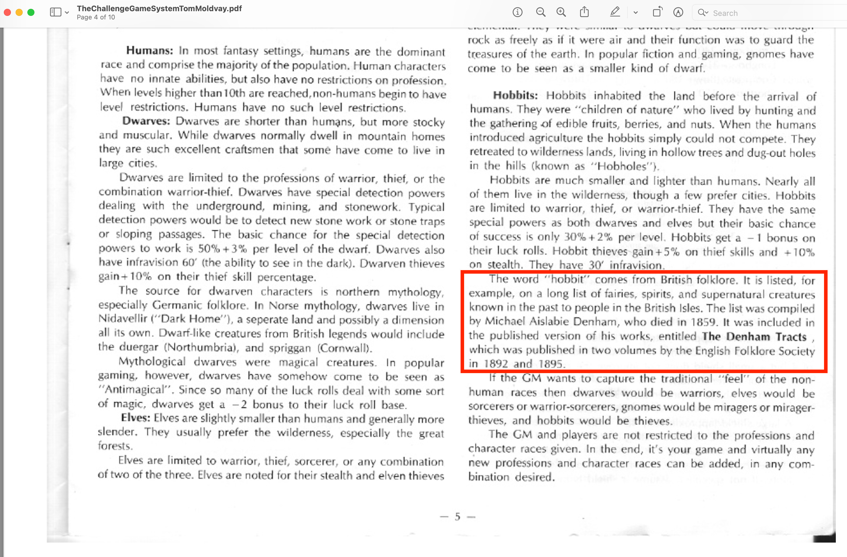 So anyway, I was skimming through my rather large collection of pdfs yesterday. This included Tom Moldvay’s The Challenge Game System® from 1986. On page 5, you can see a note on the origins of the word Hobbit.