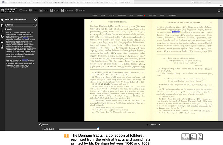 This is the kind of rabbit hole that I cannot resist exploring. So off I went in search of the Denham Tracts. Wikipedia had an entry and there were a handful of scans on archive.org. Eventually, I found what I was looking for in Volume II on page 79. Since these tracts date back to the late 1800s, it is clear that the word “Hobbit” standing alone as a type of fantastic creature is outside of copyright. However, how you describe such a creature could quickly become troublesome if the description hews too closely to Tolkien’s characters.