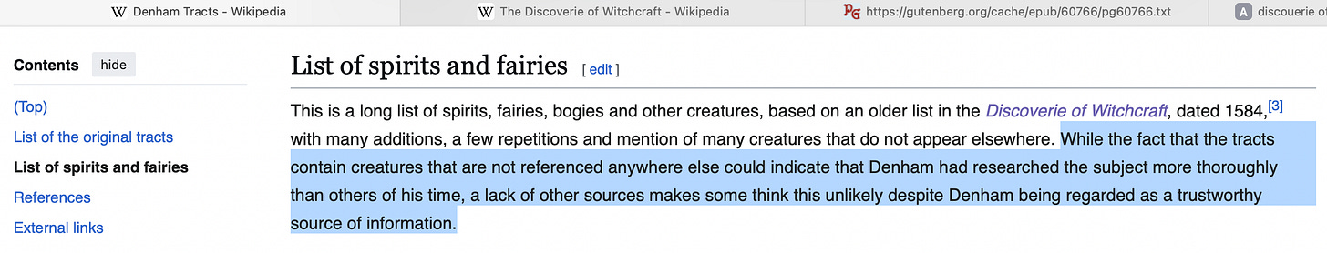 There is a shorter list, also in Discoverie of Witchcraft, that does not seem to relate back to the Denham tracts. Still, if anyone is accumulating their own list of fantastic monsters this is further fodder.