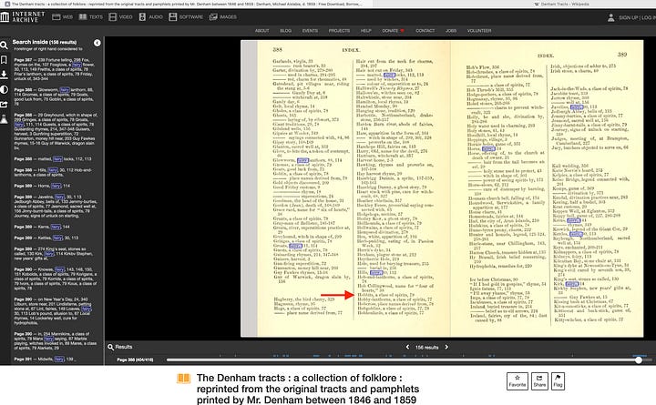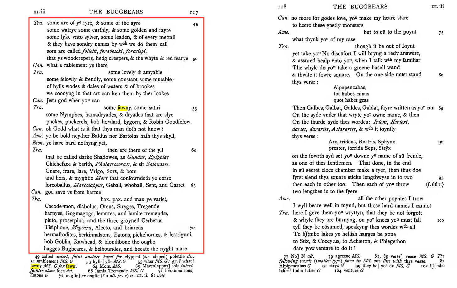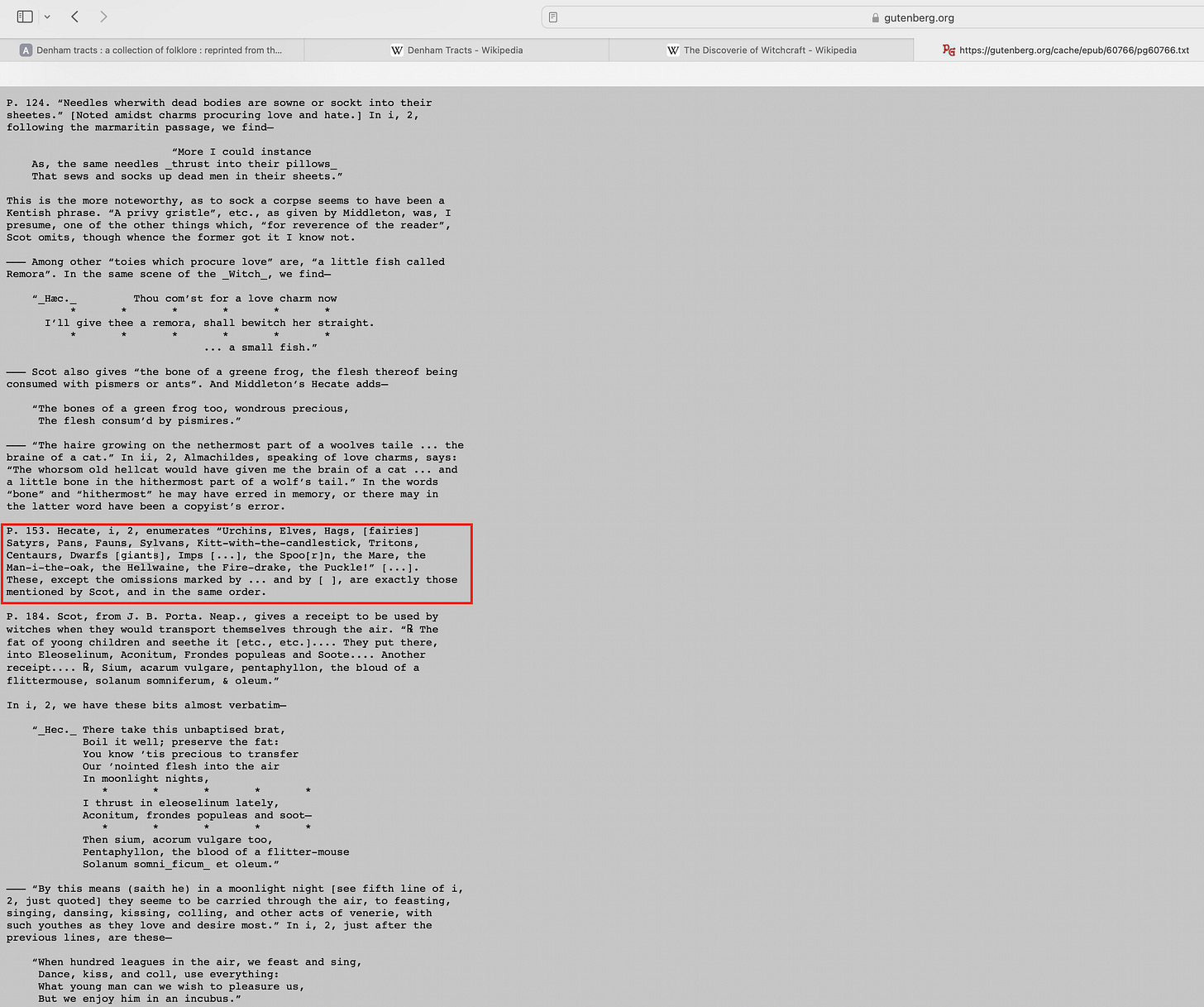 There are other books and plays from the late 1500s to 1600s that also touch on witchcraft and have shorter lists that are tangentially related to the list in the Denham tracts. For example, the character Hecate in Thomas Middleton’s The Witch (c. 1613) Act I, Scene 2 has this list: "Urchins, elves, hags, satyrs, pans, fawns, silens, kit with the candlestick, tritons, centaurs, dwarfs, imps, the spoorn, the mare, the man i' th' oak, the hellwain, the firedrake, the puckle!" Cross-referencing with Reginald Scot's list, you can spot direct matches: urchins, elves, satyrs, pans, fauns, tritons, centaurs, dwarfs, imps, the spoorn (spoorns), the man i' th' oak (men-in-the-oak), the hellwain (hell-wains), the firedrake (fire-drakes), and the puckle (puckles). "Kit with the candlestick" maps to "kit-a-can-sticks" in Scot. Incidentally, The Witch seems to be a solid tale worth checking out. It is also available on Project Gutenburg where the footnotes describe further connections to Scot’s Discoverie of Witchcraft.