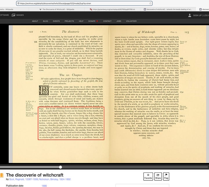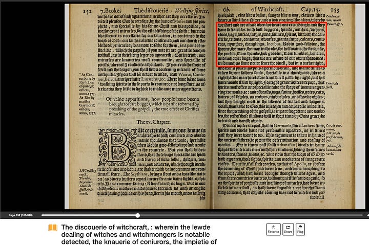 The final reference worth checking out is The Buggbears (by John Jeffere, c.1563-65). What makes this notable is that it predates Discoverie of Witchcraft by about two decades. This play is within R. Warwick Bond’s scholarly collection Early Plays from the Italian (1911), which can be found here: https://archive.org/details/cu31924013324110.
